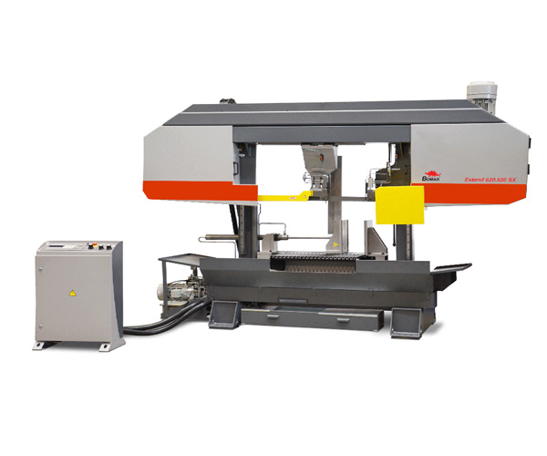 Metal band saw EXTEND 620.620 SX is a powerful hydraulic semiautomatic machine of two-column construction designed for series and highly productive cutting of material under 90° angle. Low-vibration saw cuts mean precision and long life. Polymer concrete offers the ideal damping characteristics for use in saw machines. On all Extend machines, the support,saw frames and columns are filled with a specially developed polymer concrete mixture. Coupled with pre-stressed, play-free, generously dimensioned linear guides, polymer concrete technology provides virtually vibration-free saw cuts with high cutting performance far above 100 cm2 per minute with M42 bimetal saw bands.