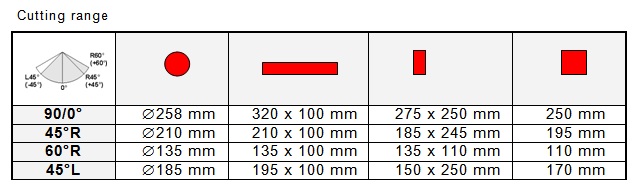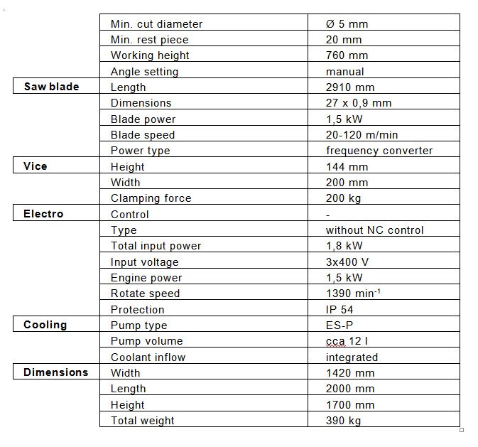 The machine ERGONOMIC 320.258 DGH is a hydraulic semi-automatic saw with cooling located in the base. Angle cuts can be performed by this machine on both sides is smooth within range -45° and 60°. Frame turning is manual. Adjustment of angle cuts is done very easily directly from the operator’s position. The machine is located on the turning console equipped with legible angle scale. The speed of the saw band is variable 20-120 m/min. Material feeding into the cut is manual. The saw can be easily controlled via controllers located directly on the control panel on the front side of the machine (see picture).