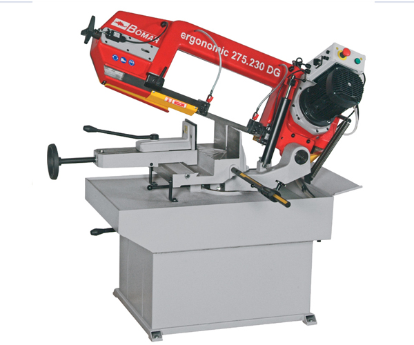 The machine ERGONOMIC 275.230 DG is a manual saw with cooling installed in the machine base. Angle cuts can be performed by this machine on both sides is smooth within range -45° and 60°. Frame turning has to be done manually. Adjustment of angle cuts can be done very easily directly from the operator’s position. The machine is located on a turning console equipped with a legible angle scale. The standard peripheral speed of the saw band is 40 / 80 m x min-1, an engine with the speed 28 / 56 m x min-1 can be installed as an option, if the customer wishes it. Material feeding into the cut is manual. The machine control is easy due to controllers located directly on the machine engine.